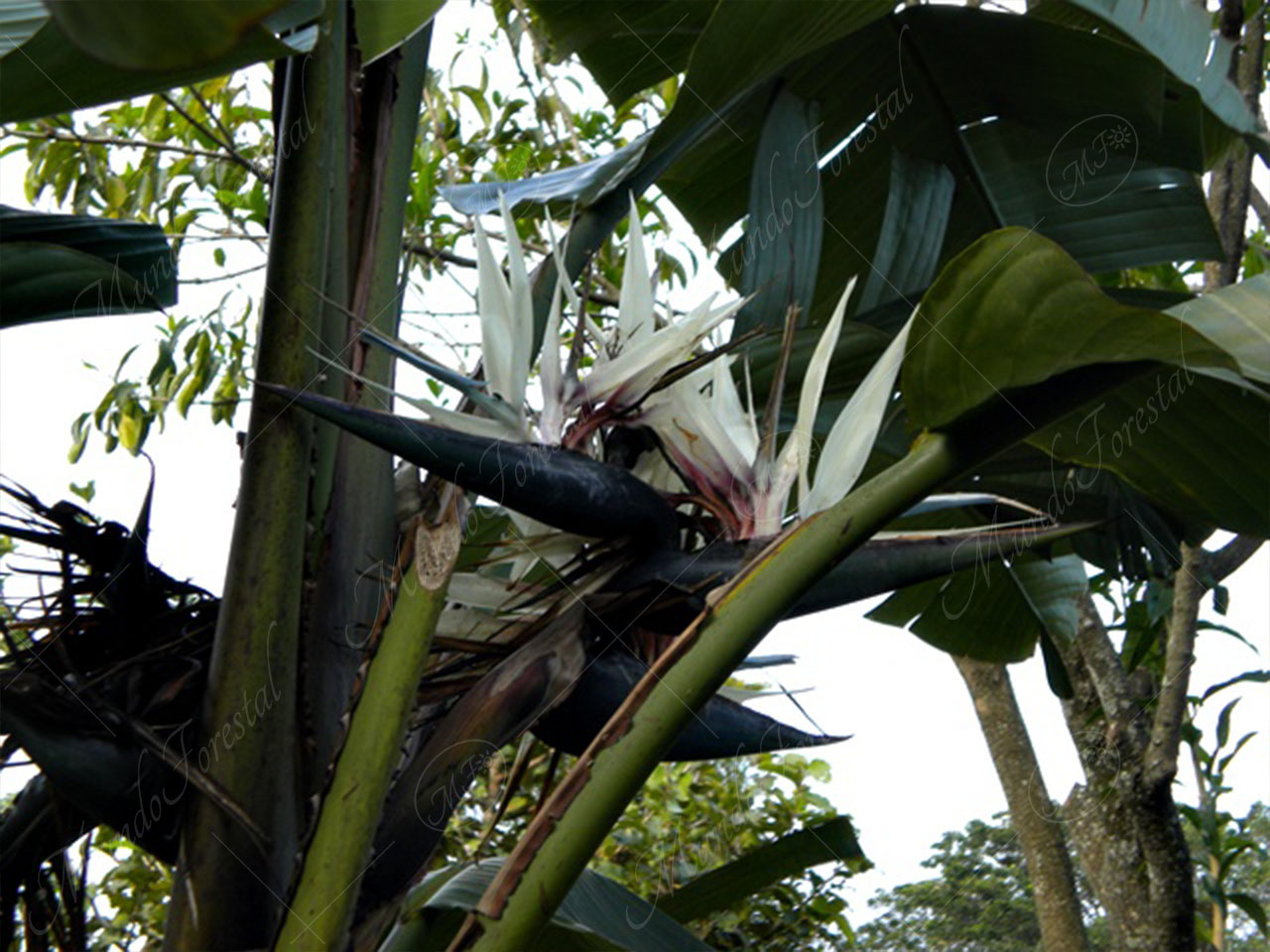 Esta especie nativa de Sudáfrica es mucho menos común que su pariente la amarilla (Strelitzia reginae) por lo que si no posee flores puede pasar inadvertida, especialmente por su gran tamaño de casi 3 m y la forma de sus hojas de casi dos metros de largo que solo se orientan en dos direcciones, la hacen confundirse con la palma del viajero (Ravenala madagascarienses) o con una Musácea.
