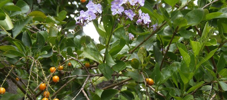 Contrario a lo que comúnmente se cree, el grano de oro es un arbusto grande totalmente nativo de nuestro país, y con un amplio rango de distribución desde el sur de los Estados Unidos hasta la cuenca del Amazonas. Es muy fácil de reconocer e identificar gracias a sus hojas pequeñas que nacen en grupos compactos a lo largo de sus ramas largas, delgadas y arqueadas. Produce atractivas flores de color azul y con olor a violeta, en ramos alargados que se forman en la punta de las ramas. Al ser polinizadas por las abejas y las mariposas, las flores producen racimos de frutos amarillos, carnosos y redondos, los cuales no son comestibles para las personas, pero atraen y alimentan a una gran cantidad y variedad de aves silvestres. Es muy atractivo en jardines por la mezcla de ramos de flores y de frutos, lo que aumenta su colorido.