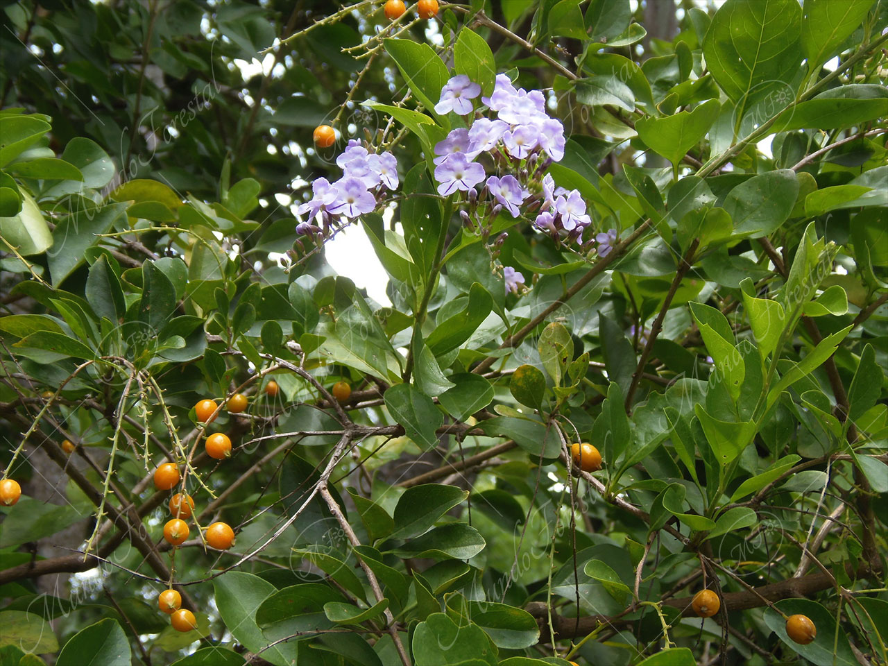 El denso y compacto follaje permanece lozano aún durante la estación más seca y caliente, y las flores y frutos se producen todo el año.