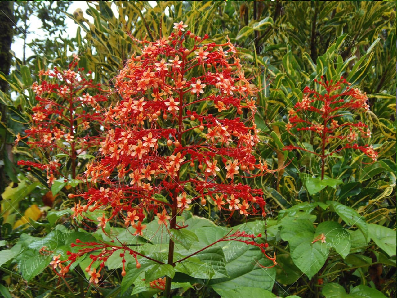 Las flores están presentes la mayor parte del año y con su delicado perfume atraen abejas, mariposas y colibríes. Se van abriendo de abajo hacia arriba. Son tubulares y están formadas por 5 pétalos de color rosado muy claro a salmón, con el centro más rojo, y con estambres muy largos y el gineceo aún más largo. El cáliz es de color rojo brillante, formado por 5 sépalos redondeados y enconchados hacia adentro, los cuales no se unen a la base del tubo. También se puede encontrar la variedad alba (Clerodendrum paniculatum ´Alba) con flores amarillo muy pálido o blancas con el centro amarillo.